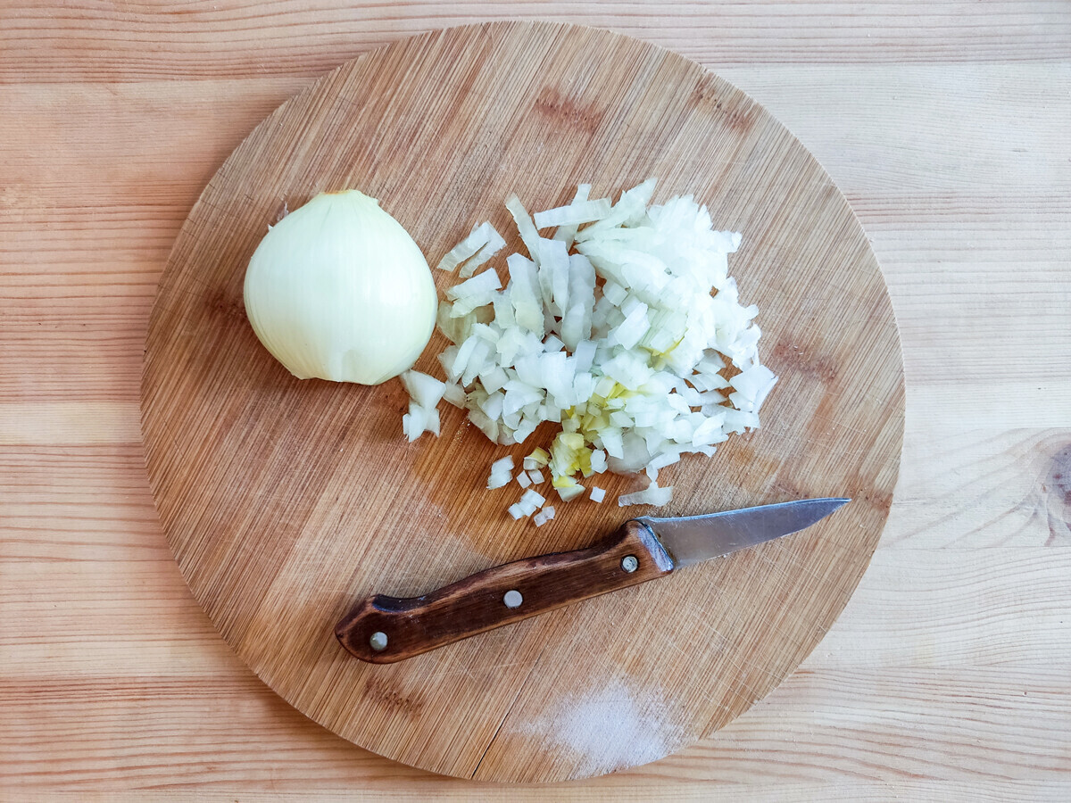 2. Мелко нарежьте лук. Холодное сливочное масло нарезать кусочками.