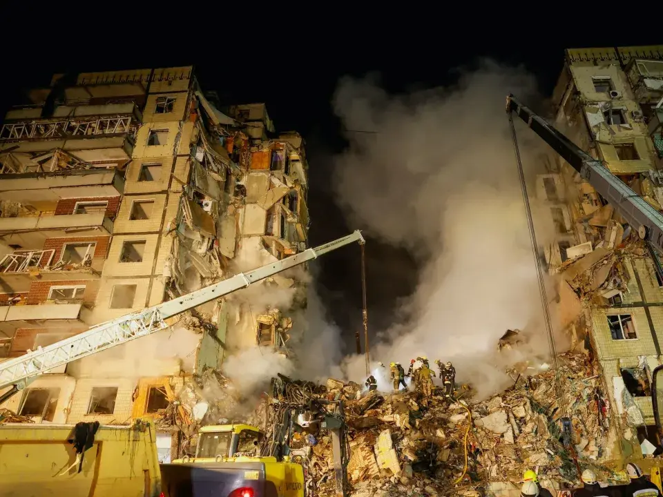 По меньшей мере 23 человека погибли в результате российского ракетного удара, разрушившего жилой дом в Днепре, центральная Украина.