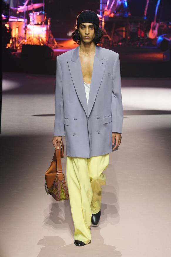 Широкие брюки в сочетании с жакетами оверсайз и пальто в пол привнесли спортивную нотку в осеннее мужское предложение Gucci. С точки зрения стиля, он избегал чего-либо слишком гладкого, даже по сравнению с эпохами бывших дизайнеров дома Тома Форда и Фриды Джаннини. Поскольку шапка-бини была вездесущей в большинстве образов, в восьмидесятые она была тяжелой, многослойные гетры и пикси-сапоги были повторяющейся тенденцией. Аксессуаров было сведено к минимуму, по крайней мере, на фурнитуре, которую так любил Микеле, но сумки желтого и розового цветов добавили красок, а топ и брюки из люрекса были намеком на его инклюзивность и винтажные творения.