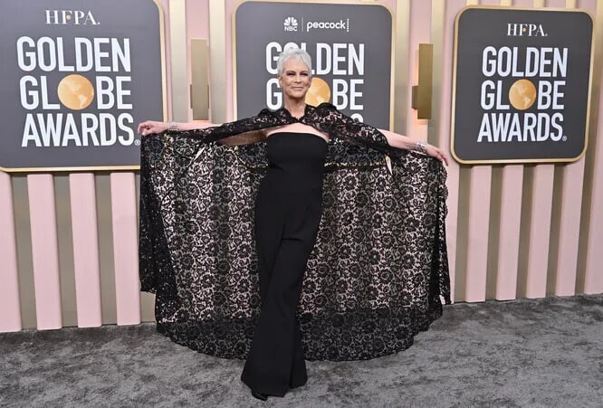 Ещё 1 актриса, номинированная на премию, Джейми Ли Кертис стала одной из самых незабываемых во всех отношениях звездного неба церемонии. Она пришла на церемонию награждения в черном одежда без бретелек от Valentino с накидкой и большими браслетами.