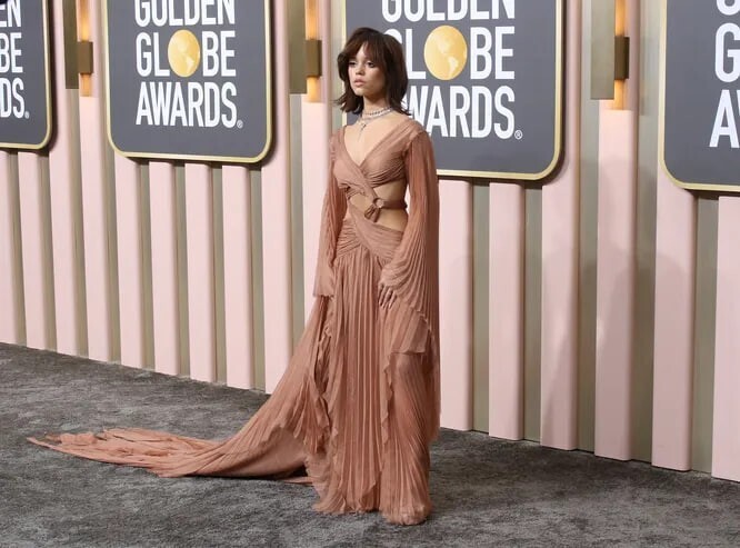 Звезда «Среды» Дженна Ортега категорически отказалась от угрюмого вида семейки Аддамс собственного персонажа и позировала фотографам, выглядя прекрасно. Одежда цвета чайной розы, являющееся собственностью Gucci, вошло в количество самых внезапных, прекрасных образов премии «Золотой глобус — 2023». Краска платьица имел возможность бы устроить актрису старше, но части на нем не дали данному статься.