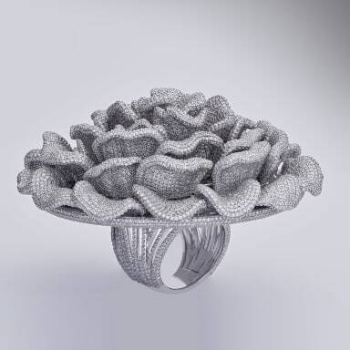 Замысловатая структура кольца была создана путем заливки жидкого золота в пластиковую форму, чтобы сформировать 41 уникальный лепесток гриба. Затем каждый лепесток был вручную украшен натуральными бриллиантами.