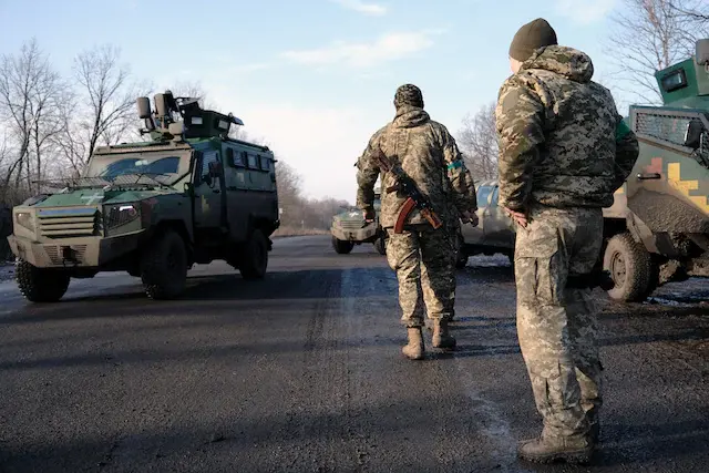 Солдаты в четверг возле сильно пострадавшего города Бахмут, Украина.