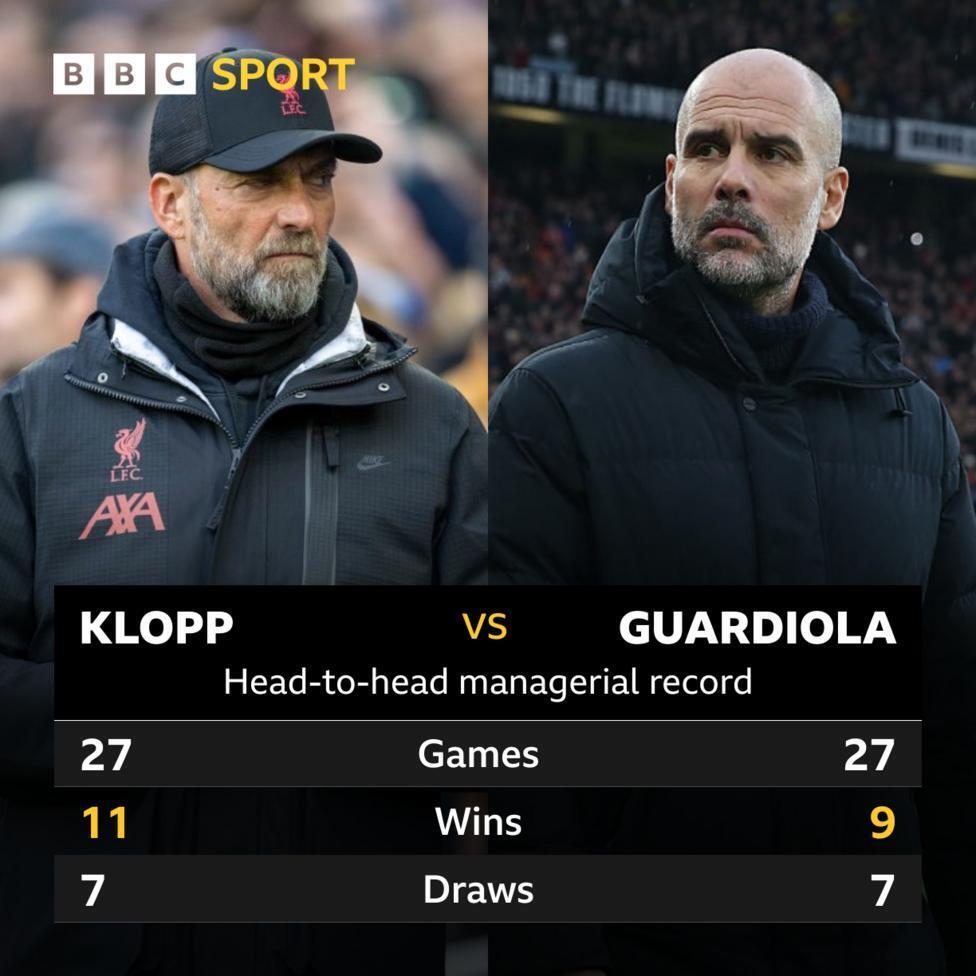 Возглавляя Дортмунд, Клопп выиграл три из восьми встреч с мюнхенской «Баварией» Гвардиолы. Сейчас в «Ливерпуле» Клопп выиграл восемь из 19 матчей против «Сити» Гвардиолы.