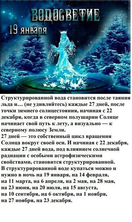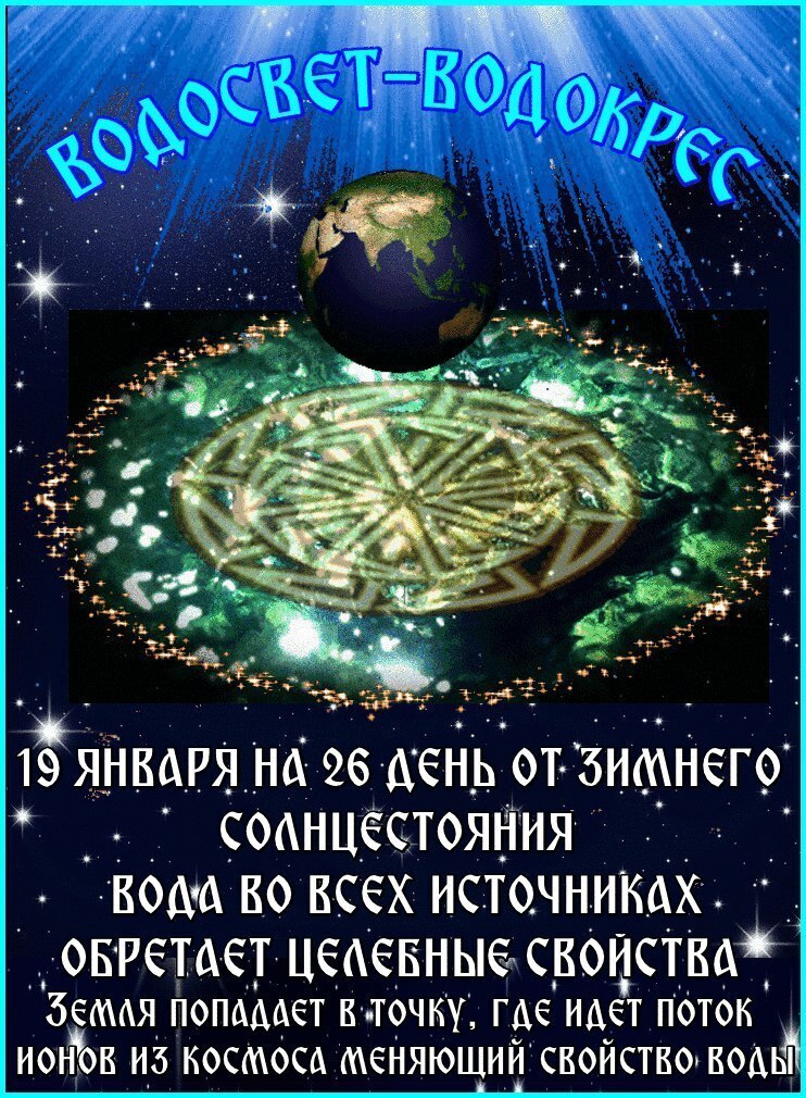 Андрей Андреевич, Вы правильно сказали что церьковь к этому дню не имеет ни какого отношения, но и Крещение Господне к этому дню так же не имеет ни какого отношения. Христианская церковь присвоила себе этот день, так как не смогла его уничтожить как языческий праздник. 18 - 19 января день Большого Святокреса, до него 6 января идет малый Святокрес - это исконо славянские традиции насчитывающие не одно тысячелетие. Эти традиции зародились за долго до христианства. Нас уверяют в том, что наша государственность зародилась в 980 году нашей эры. Но это далеко не так. Наша история насчитывает более 20 000 лет, и это неоднократно доказано. Откуда пошла современная история навязанная нам. Она пошла благодаря трудам немецких историков Миллера и Шлоссера находящихся в Академии Наук Российской Империи при Екатерине 2 и занимающие там руководящие посты. Они были противниками настоящей истории славян которую проповедовал Михаил Ломоносов. После смерти Ломоносова исчезла его библиотека и все документы подтверждающие правоту Ломоносова. Вядосвет или как его называют Водокрес - это астрономический праздник славян.