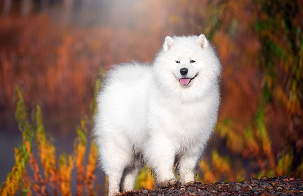 Самоед — очень пушистая собака бело-кремового окраса, происходящая от лайки. Лайка — это шпиц с густой белой шерстью. Самоед возник в Сибири, где жил среди кочевых оленеводов. Название самоеда произошло от народа, с которым он сначала жил: самодийского народа.У этих пушистых собак сохранились пастушьи наклонности, они также упрямы, хотя и общительны. Они могут жить от 12 до 13 лет, а самцы достигают веса до 66 фунтов. Им нужно много внимания и общения. Если им становится одиноко, они, как правило, становятся очень разрушительными.