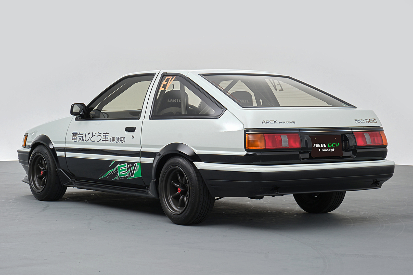 Toyota AE86 оснащена электроприводом и механической коробкой передач. Используются серийные детали, такие как гибридный двигатель Tundra и батарея Prius.