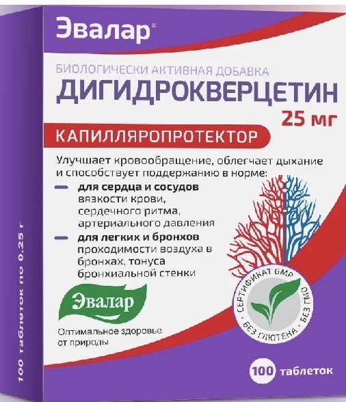 Именно Дигидрокверцетин от Эвалар зарегистрирован в России как средство для поддержания здоровья бронхолегочной системы, тонуса бронхиальной стенки, функции легких и бронхов; предотвращения загущения крови и тромбоза мелких сосудов