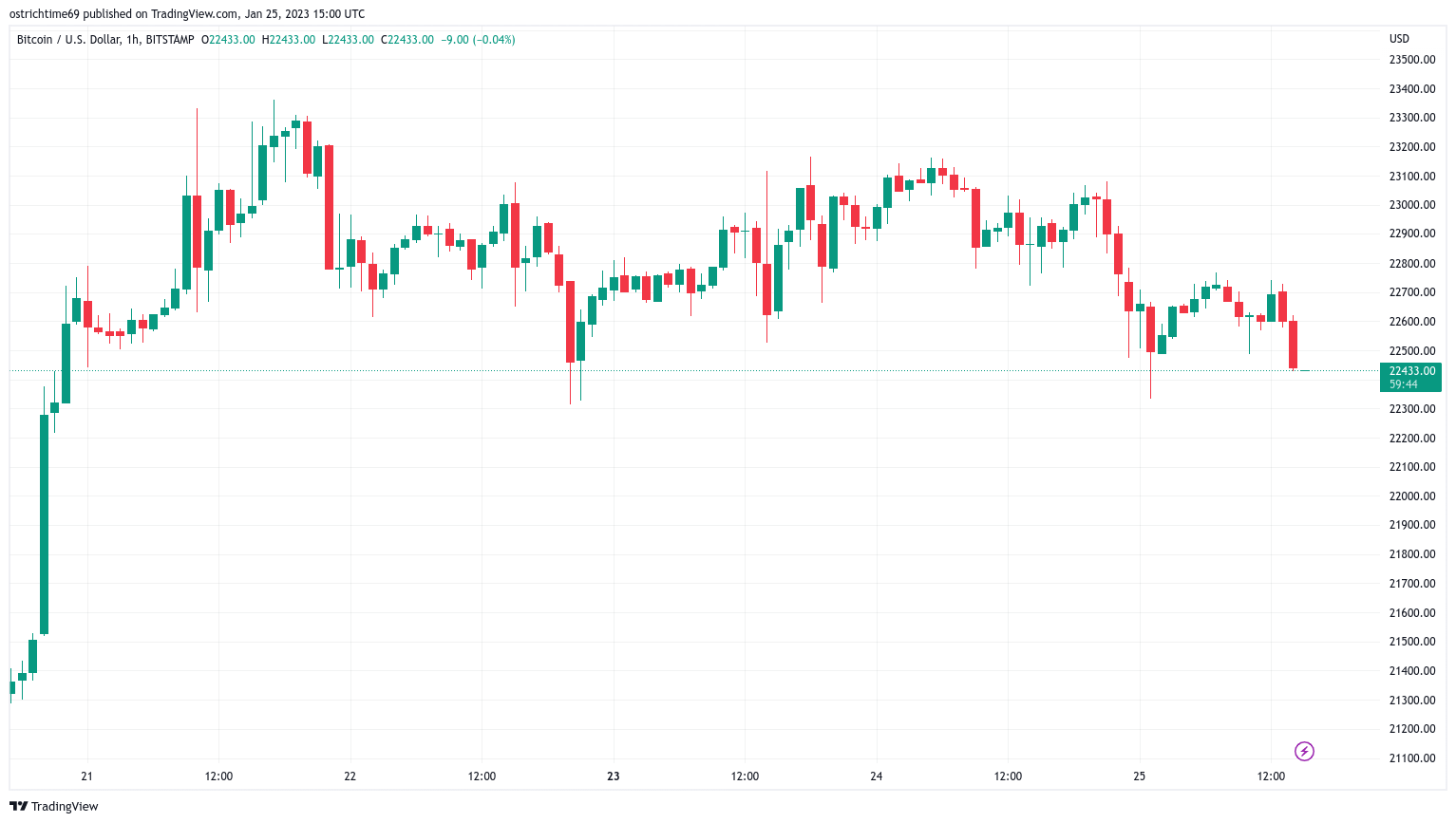 Данные Cointelegraph Markets Pro и TradingView показали, что курс BTC/USD опускается ниже 22 500 долларов после того, как он не смог преодолеть сопротивление около пятимесячных максимумов.