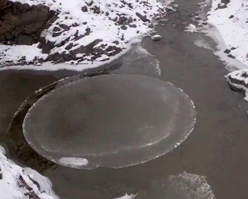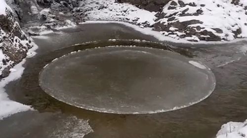 На поверхности реки образовался почти идеально сформированный диск льда, который к тому же вращался. Дэн, который снимал видео и делал фотографии, добавляет, что зрелище было сюрреалистическим.