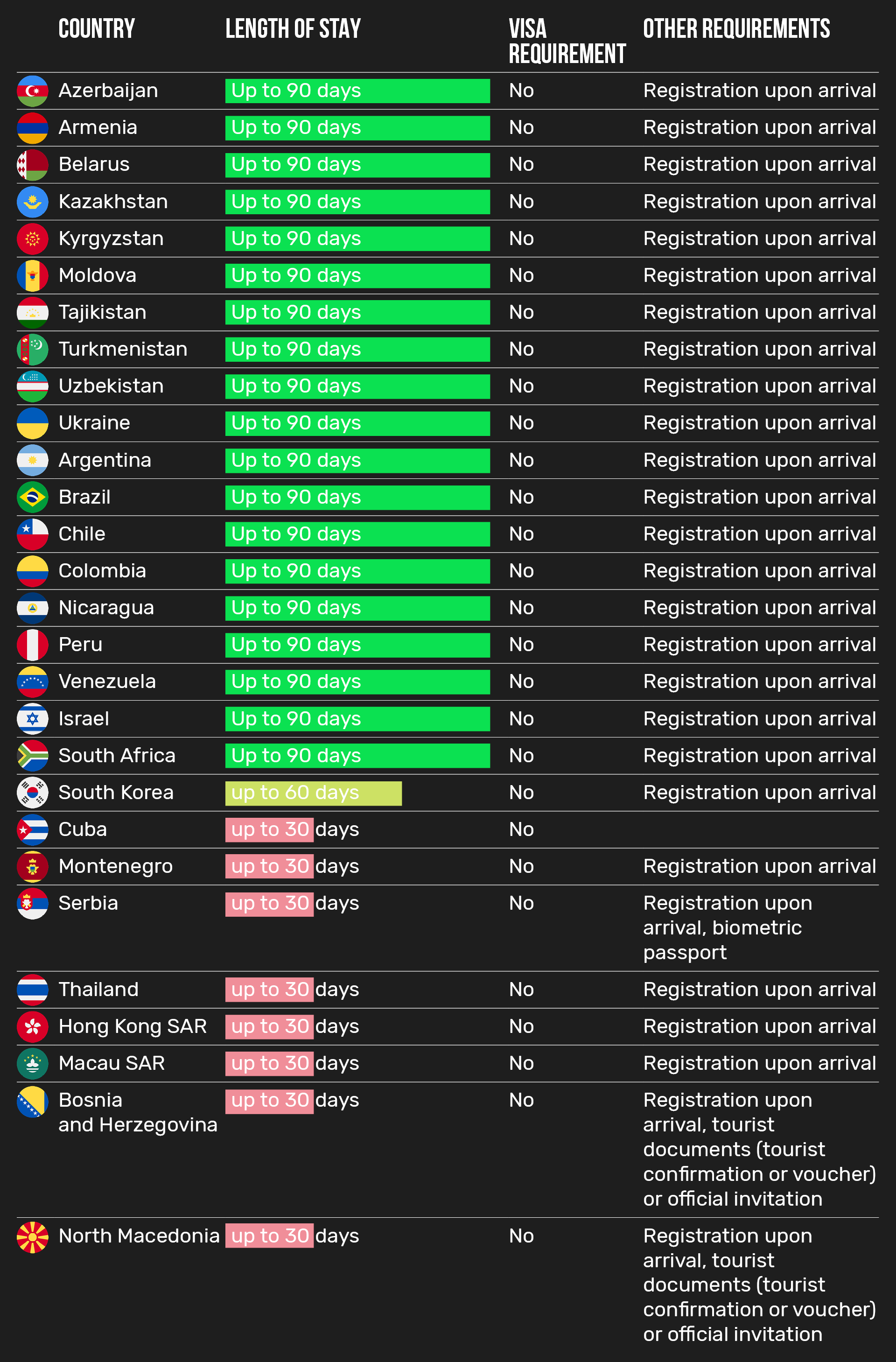 Граждане Кубы, Черногории, Таиланда и Южной Кореи также могут посещать Россию без визы. Однако им разрешено находиться в стране только до 60 дней. Граждане Сербии имеют право на безвизовый въезд в Россию только при наличии биометрического паспорта, выданного после 2008 года.