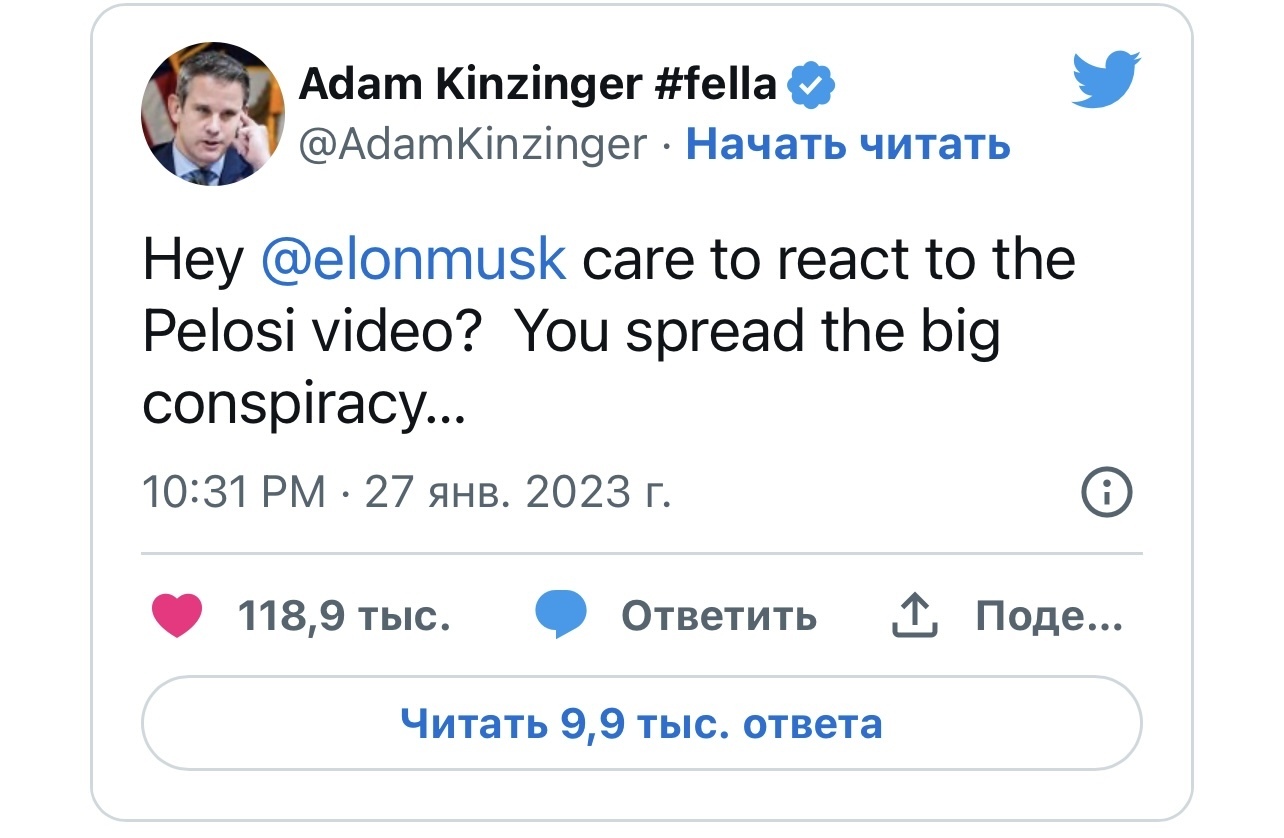 Бывший республиканец из Иллинойса Адам Кинзингер написал в Твиттере в пятницу: "Эй, @elonmusk, хочешь отреагировать на видео Пелоси? Вы распространяете большой заговор..."