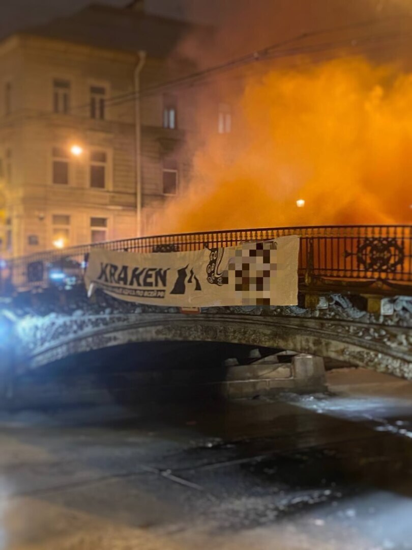 Несколько участков трассы Москва - Питер висят на баннерах КРАКЕН, в которых есть QR-коды, чтобы можно было легко добраться до площадки и купить наркотики и буквально сегодня ночью в центре Питера появились подобные баннеры. Неизвестный повесил огромный рекламный баннер и зажигал фаеры, чтобы привлечь к себе внимание.
