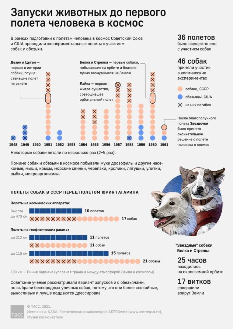 Как животные покоряли космос и сколько запусков с собаками и мартышками было совершено до полета Юрия Гагарина — в нашей инфографике
