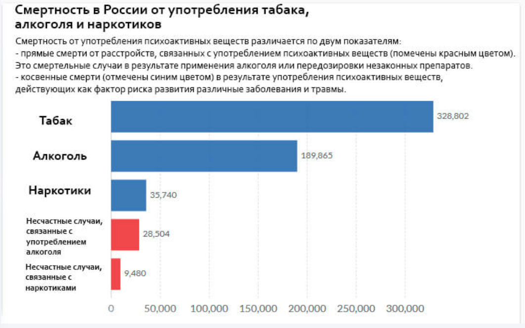 И вот смертность за год от табака, алкоголя и наркотиков. Видимо власть и сам Путин всех заставляет, курить, пить и колоться.
