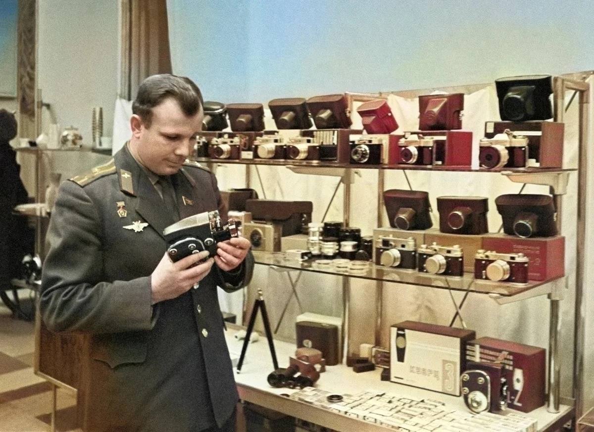 Камеру которую держит Юрий Гагарин я в живую не видел, но вот некоторые фотоаппараты справа на полке хорошо помню.