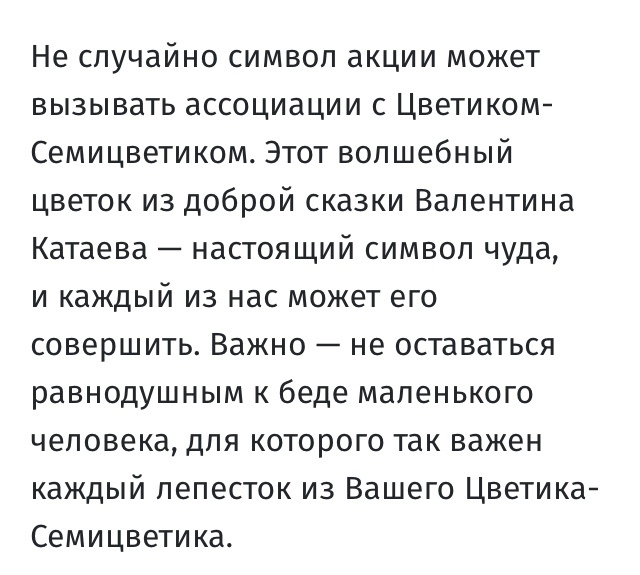 Десятки и сотни детских жизней зависят просто от человеческой доброты. Простые телезрители совсем даже не богатые люди, даже более чем. Жертвуют кто сколько может. 50, 100, 200 рублей, и каждый этот маленький вклад, как ручеёк доброты, вливается в общий мощный поток спасающий маленькие жизни. Каждый четверг показывают конкретного ребёнка, раскатывают о чьей-то огромной беде, когда семья не может справиться сама с навалившимся на них горем. Когда все средства и возможности уже исчерпаны, когда родители подавлены одним и общим горем - болезнью ребёнка.