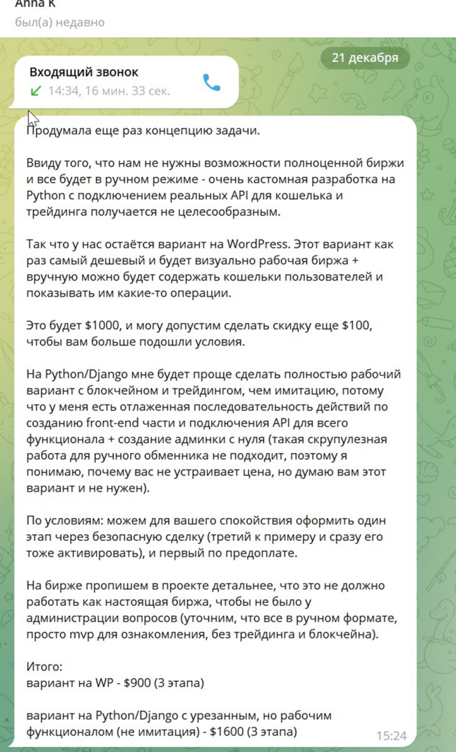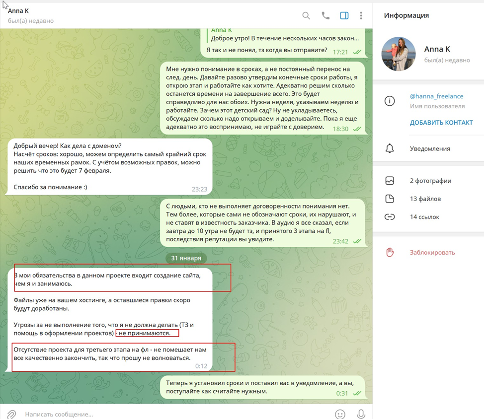 Уже 17 января обманщица пишет, что результат клиенту будет отправлен 24 января, она уложится в этот период, полностью закрыв проект. Поскольку заслуженные негативные отзывы Анна Диесперова на бирже от заказчика не получила, клиенту оставалось только звонить ей и писать в Телеграме. На звонки заказчика после 20 января Анна отвечала неохотно, искала отговорки, но уверяла, что заказ доделает.