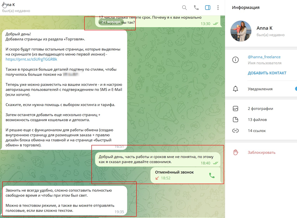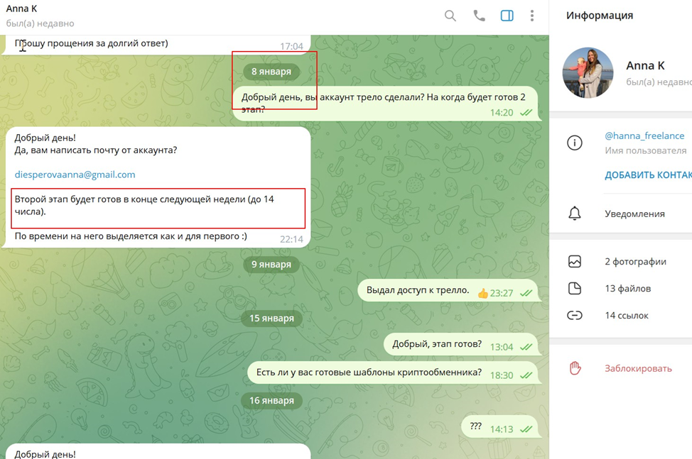 Мошенница по 2-3 дня игнорировала сообщения клиента в Телеграме, ссылаясь на разные проблемы, в том числе, отключения света. В то время, когда клиента, оплатившего деньги вперед, мошенница игнорировала, на биржу она заходила регулярно, даже активно подавала свою кандидатуру на новые проекты.