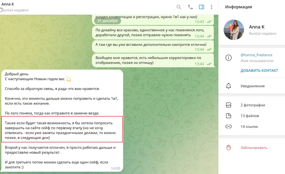 Уже 5 января фрилансер Анна Диесперова написала заказчику, озвучив просьбу закрыть на бирже второй этап, хотя ранее подобное не оговаривалось.
