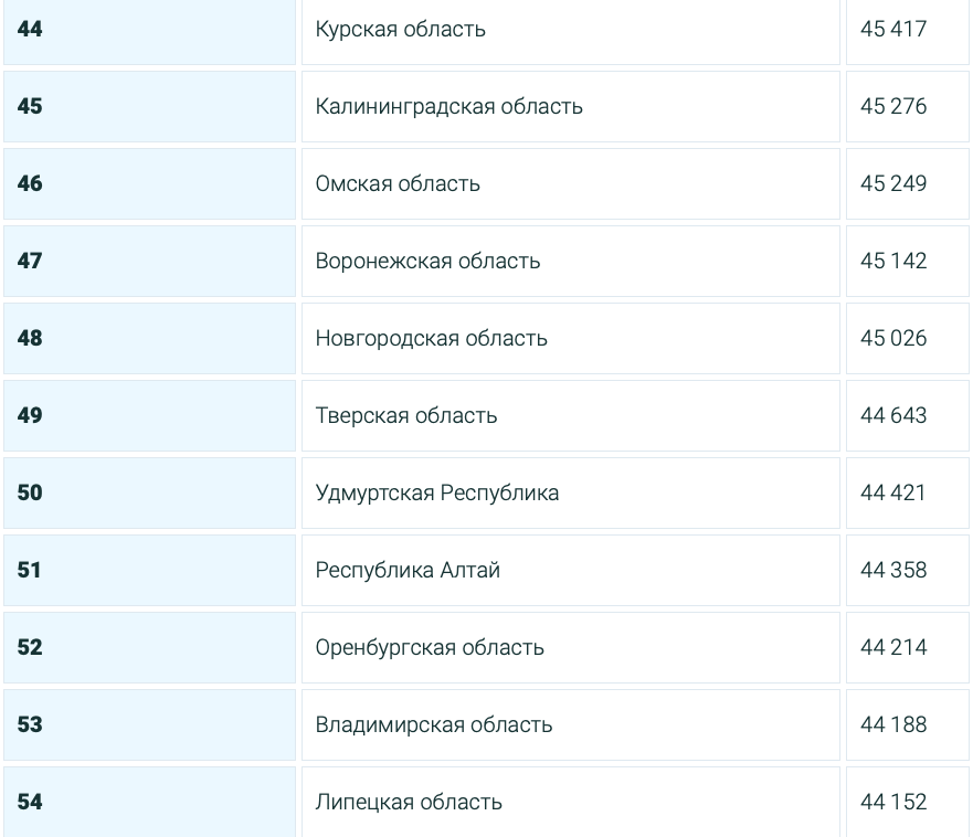 У нас в Тверской области средняя зарплата 44 643 рубля.