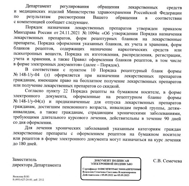 По поводу льготных лекарств. Приказ Мин здрава № 1094н от 24.11.2021г. Хроникам могут назначаться на 180 дней. Но могут и не назначаться??? Если выезжаешь в другой городна 2 месяца, могут дать жизненно важные гормональные препараты а могут и не дать, какое настроение у руководства поликлиники будет. А то что не выдача этих лекарств чревато смертью пациента, приказ умалчивает!!!