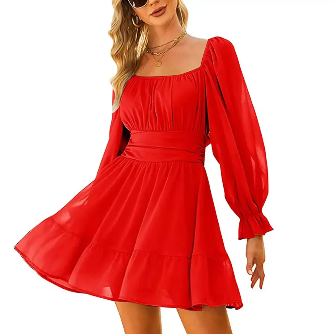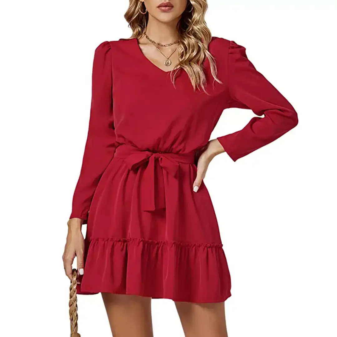 Мини-платье трапециевидной формы Umenlele с длинными рукавами бордового цвета