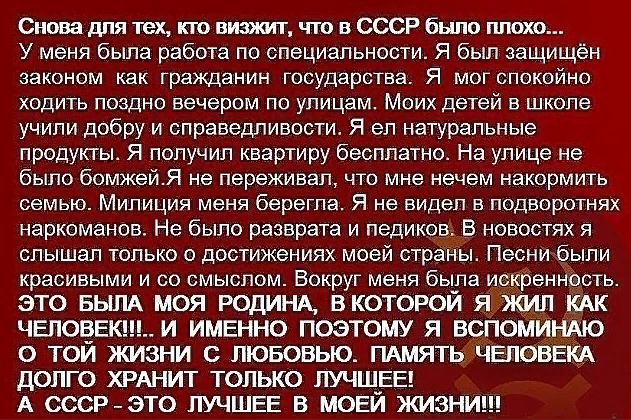 Вы точно не русская,так как не знаете ничего про ту жизнь в стране советов,в которой народ жил,учился и творил,а творил чудеса сообща все вместе.Люди радовались жизни,получали бесплатное образование,работали с задоринкой и знали что их ждет завтра.При царе народ был холопом и выполнял все,что ему сказал царь и его "свита",платить неподъемные налоги,работать от зари и до зари.Сейчас то же время,что и при царе,работаем по 16-18 часов,а зарплата то нищенская,приходится идти к барину просить милостыню-ссуду,кредит,и на всю оставшуюся жизнь в кабале,по уши в долгах.как в шелках.А вы наверное от своих родителей "наследство"получили,а теперь его прокатываете по заграницам.