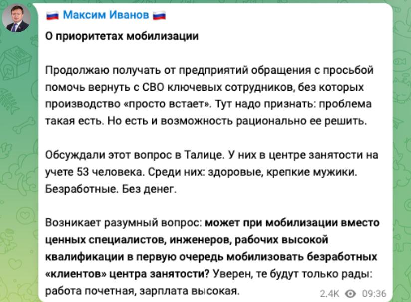 Из слов, сказанных Максимом Ивановым, мы видим, что он получает от работодателей обращения с просьбой посодействовать возвращению из зоны СВО своих ценных и ключевых сотрудников фирм.