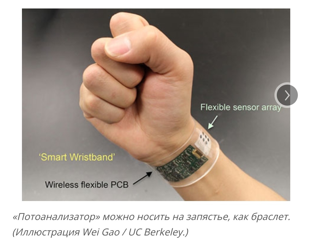 #Технологии полезные для людей, это например «Умный браслет», разработанный Калифорнийскими учеными, и который следит за биологической составляющей пота. Браслет способен одновременно определить четыре вида химических веществ, и измерить температуру тела.