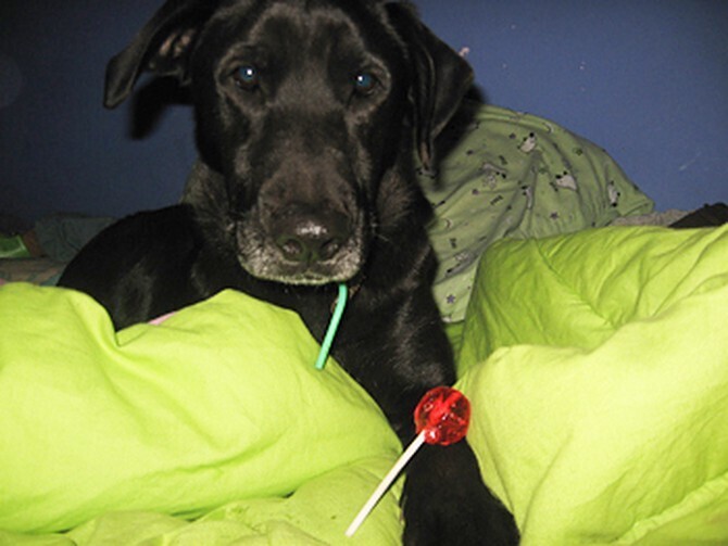 Наша собака Бэйли Бу - это помесь золотистого ретривера, черного лабрадора и немецкой овчарки. Она любит леденцы. Однажды она поехала с нами на внедорожнике, и нам пришлось бежать за чем-то в магазин, и мы оставили ее в машине с работающей машиной. Один из детей купил кучу этих клубничных сосунков с натуральным вкусом. Мы возвращаемся в машину и слышим этот сосущий звук, и я обернулся и сказал: «Бейли», и она высунула голову с заднего сиденья с присоской, свисающей изо рта. Она сосала его. Было так забавно видеть ее с этим, свисающим изо рта! Она любит их. Она любит Хэллоуин из-за леденцов.