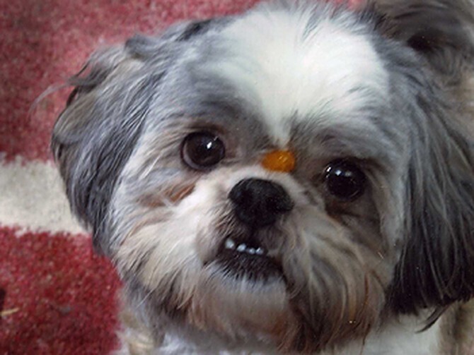 У меня есть ши-тцу, очаровательный, но не слишком умный! Он крупный маменькин сынок и хочет откусить от меня все, что я ем. Однажды я сидел за обеденным столом, а рядом тихонько сидел Типпи (он никогда не попрошайничает, только просверливает в тебе дырки глазами!), но каждый волосок на его теле дёргался! Я ела салат и знала, что он не будет есть зелень, но у меня в салате еще был мандарин, так что я отломила небольшой кусочек апельсина и бросила ему. Я думал, что он поймал его и ест, но он продолжал обнюхивать пол и скулить. Я не знал, хочет ли он большего или чего. Я позвал его, и он посмотрел на меня, и прямо над его носом к шерсти прилип кусочек мандарина! Он чувствовал запах, но не мог найти. Я чуть со стула не упал от смеха тогда я схватил камеру и сделал снимок. Внукам понравилось!