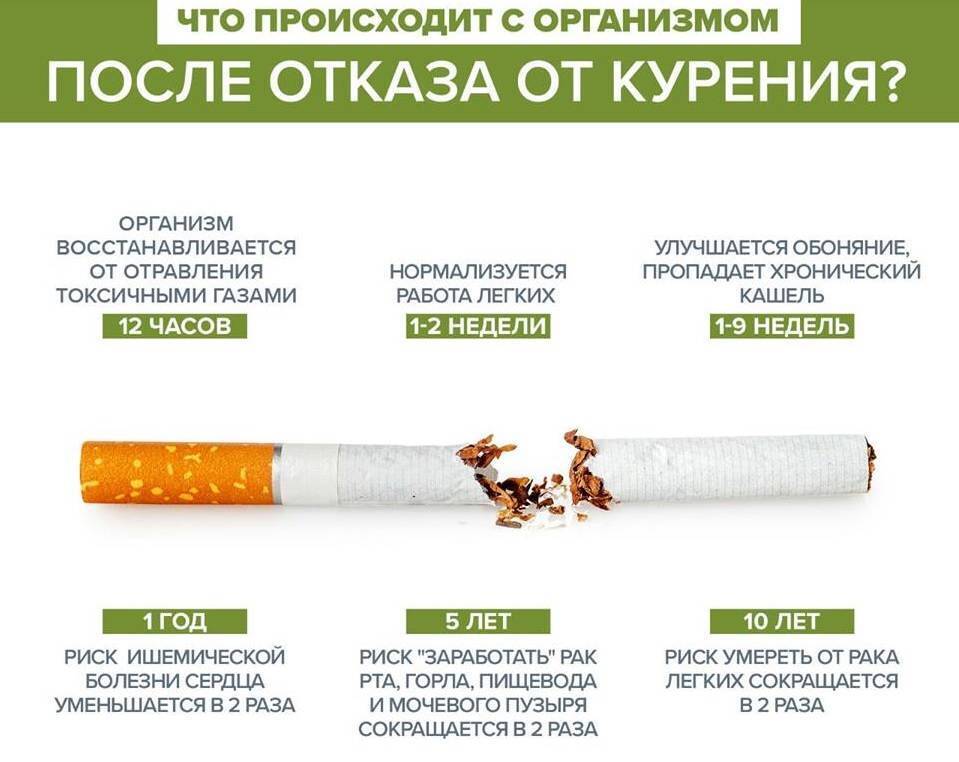 Те, кто перешагнул порог одного года, находятся на пути к тому, чтобы пересечь отметку пяти лет без сигарет. В этот период вдвое снижается и риск кровоизлияния в мозг. Дополнительным преимуществом после этого периода является снижение вдвое риска развития рака , такого как рак ротовой полости, пищевода и мочевого пузыря.