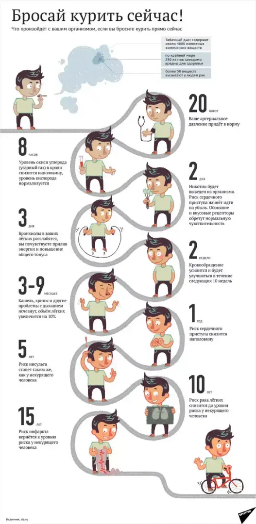 После того, как вы были без сигарет в течение восьми часов, уже начинают проявляться положительные эффекты на ваш организм. Поскольку вы не курите, количество окиси углерода в вашей крови сразу уменьшается вдвое. Угарный газ является токсичным веществом в табачном дыме. Положительным результатом этого является то, что снабжение кислородом ваших клеток и ваших органов может снова достичь нормального уровня.