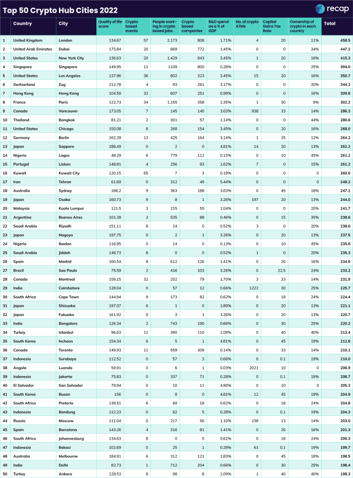 Согласно исследованию, проведенному компанией Recap, Лондон является самым крипто-готовым городом в мире для бизнеса и стартапов. Исследование учитывало восемь ключевых точек данных, включая налоги, банкоматы, рабочие места и события в криптоиндустрии, и показало, что Лондон возглавляет список 50 крупных городов с инфраструктурой, готовой к массовому внедрению криптовалют.