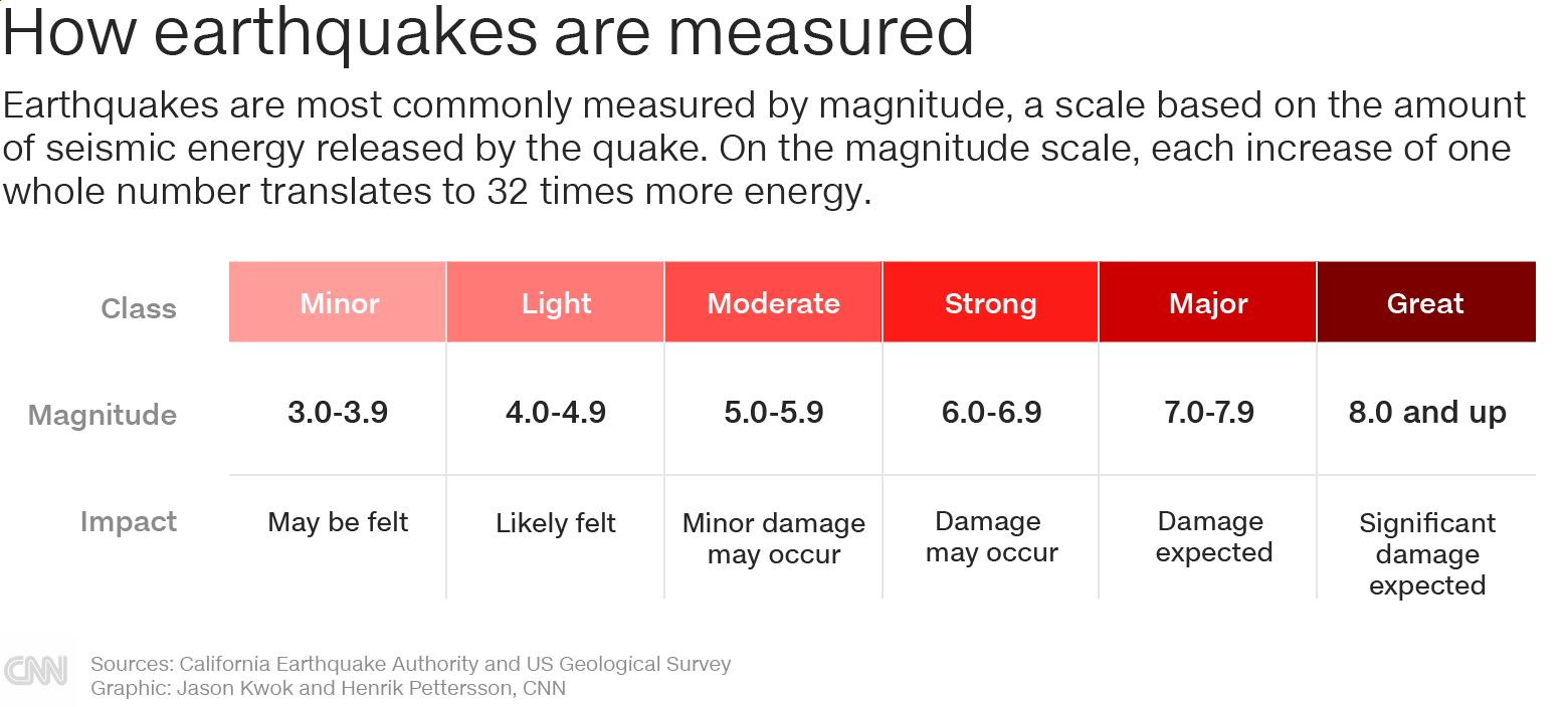 Вот классы магнитуды , согласно Калифорнийскому управлению по землетрясениям: