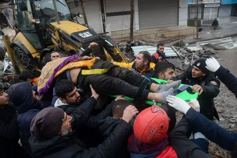 Спасатели и волонтеры выносят человека, спасенного из-под обломков в городе Диярбакыр, Турция, 6 февраля 2023 года, после землетрясения магнитудой 7,8, произошедшего на юго-востоке страны. Тысячи людей, как опасаются, погибли после того, как землетрясение потрясло турецко-сирийскую границу за ночь.