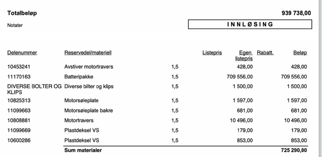 Сумма была непомерно велика как для Маркуса, так и для сотрудников сервисной службы, которые отправляли новые сообщения производителю, чтобы проверить, не произошла ли ошибка. Они не сделали этого. По словам производителя, сумма была правильной. Сотрудники сервисной службы отреагировали откровенно и сказали Маркусу и норвежским журналистам, что впервые в своей практике слышат, чтобы аккумулятор стоил в несколько раз дороже, чем автомобиль, и не могут объяснить, почему у производителя такие высокие цены на автомобильные аккумуляторы.