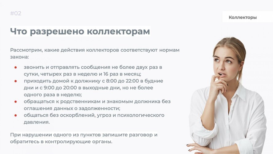 распространять конфиденциальную информацию о заемщике, в том числе ближайшим родственникам. Сообщать о кредите и сумме долга коллектор может только заинтересованным лицам, то есть самому должнику, поручителям по кредиту, залогодержателям и т. д.;