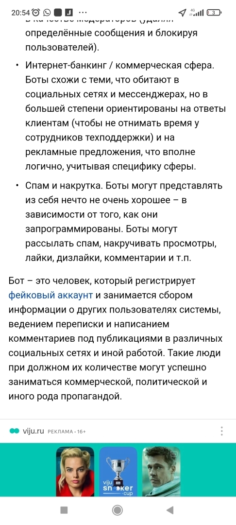 Доброго времени суток! Сегодня опять хочу обратиться к вам с просьбой, помочь мне разобраться с таким понятием как "боты". А эта тема заинтересовала меня вот в связи с чем. Вчера внучке задали подготовить проект, по нашему написать доклад. Решила ей помочь. Я в своём телефоне ищу информацию, она в своём. Вдруг слышу: "Маруся , подбери, пожалуйста, информацию на следующую тему" и называется тема. Из любопытства стала прислушиваться. Услышала ответ: " Говори чётче. Я не поняла". Внучка опять: "Маруся, подбери, пожалуйста, информацию по теме...". Ответ: "Не поняла, повтори". Уже я не выдержала:"Подбери информацию по теме...". Опять: "Не поняла." Я не выдержала, говорю: "Тогда иди в жо..." А Маруся мне в ответ:"Как тебе не стыдно? У ботов тоже есть чувства". Да голос стал обиженным. "Ну"-говорю- "извини! Я больше так не буду." "Ничего, я больше не сержусь! Если я тебе ничем не могу больше быть полезной, то до свидания!". После такого разговора мне стало немного не по себе...