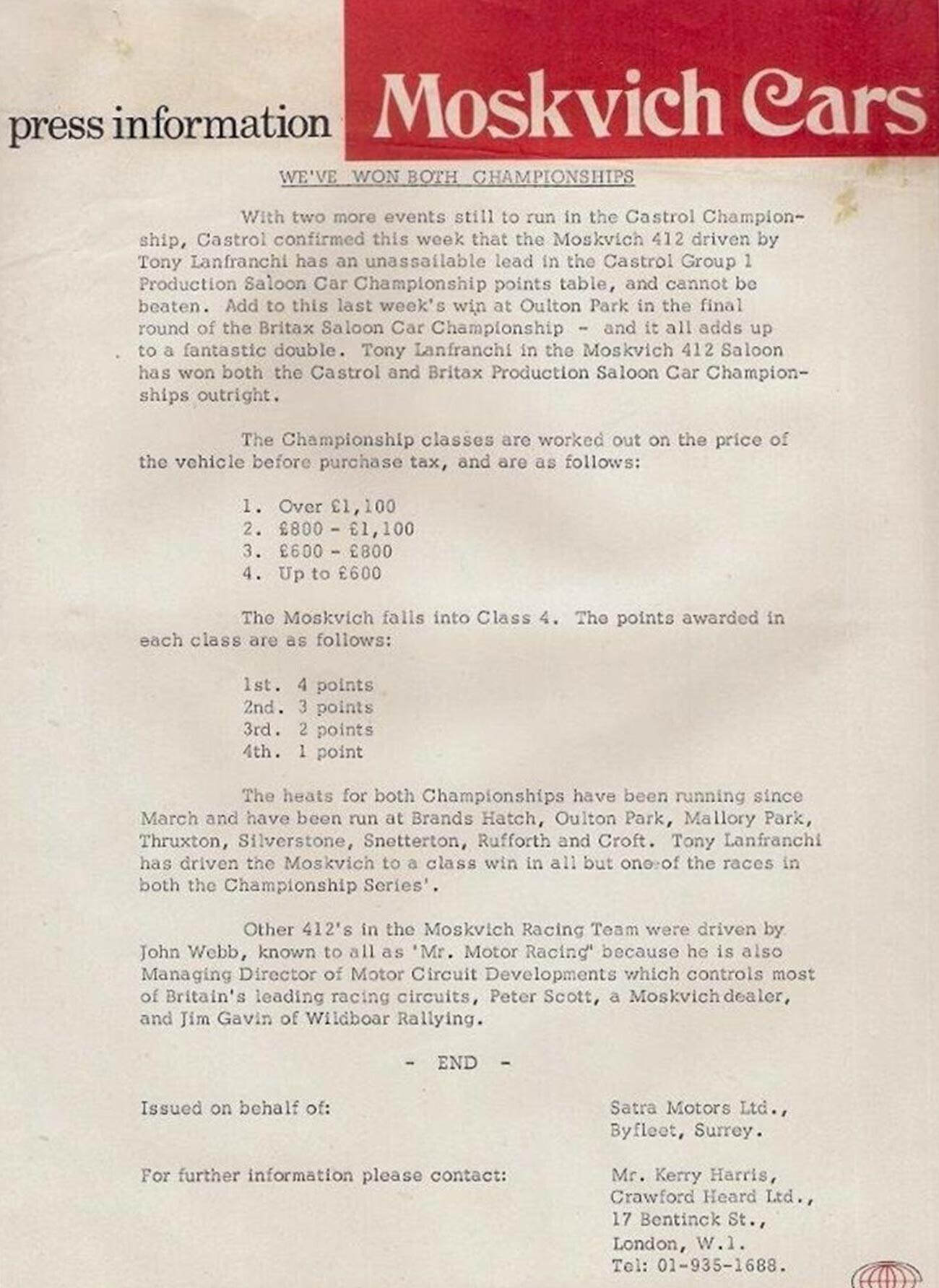 В 1972 году британский автогонщик Тони Ланфранчи выиграл гоночные серии Castrol и Britax за рулем "Москвича 412". В соответствии с правилами, автомобиль стоимостью менее 600 фунтов стерлингов попал в последнюю, четвертую группу (разделение было основано на стоимости автомобиля, а не на его технических характеристиках). Высокий результат Тони в своей категории позволил ему и "Москвичу" обойти главных соперников - BMW 2002 Tii и Ford Capri 3000 GT - и одержать окончательную победу.