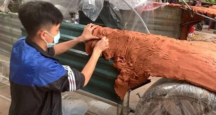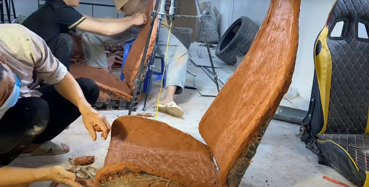 После того как создали стальной каркас, ребята обклеили его скотчем в несколько слоев, а после на созданный каркас начали налепливать самую настоящую глину!