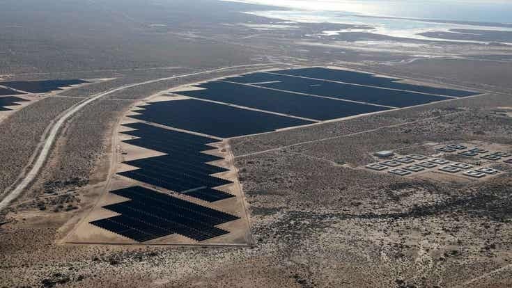 В Пуэрто-Пеньяско, недалеко от вершины Калифорнийского залива и на границе с Аризоной, ряды солнечных батарей, которые наклоняются вслед за проходящим солнцем, убегают к горизонту, паря над песком. Проект в конечном итоге охватит 5000 акров на переходе, где пустыня сглаживается между бурными коричневыми горами и синим морем.