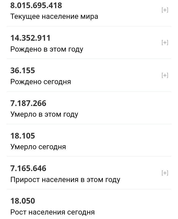 Население Земли превысило 8.015 млрд человек, не понятно радоваться от этого или нет. Когда глобалисты и миллиардеры заявляют,что у них цель оставить миллиард.