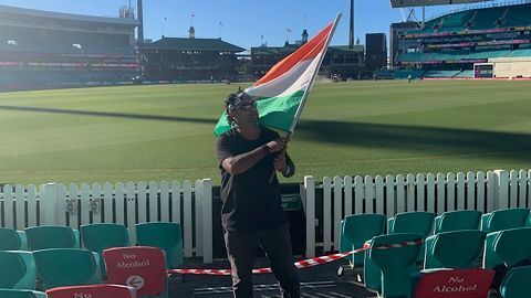 Кришна Кумар размахивает индийским флагом во время тестового матча между Австралией и Индией.
