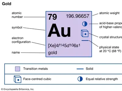 золото (Au), химический элемент, плотный блестящий желтый драгоценный металл группы 11 (Ib), периода 6 периодической таблицы элементов. Золото обладает несколькими качествами, которые делали его исключительно ценным на протяжении всей истории. Он привлекателен по цвету и яркости, прочен практически до неразрушимости, очень пластичен и обычно встречается в природе в сравнительно чистом виде. История золота не имеет себе равных в истории любого другого металла из-за его воспринимаемой ценности с самых ранних времен.