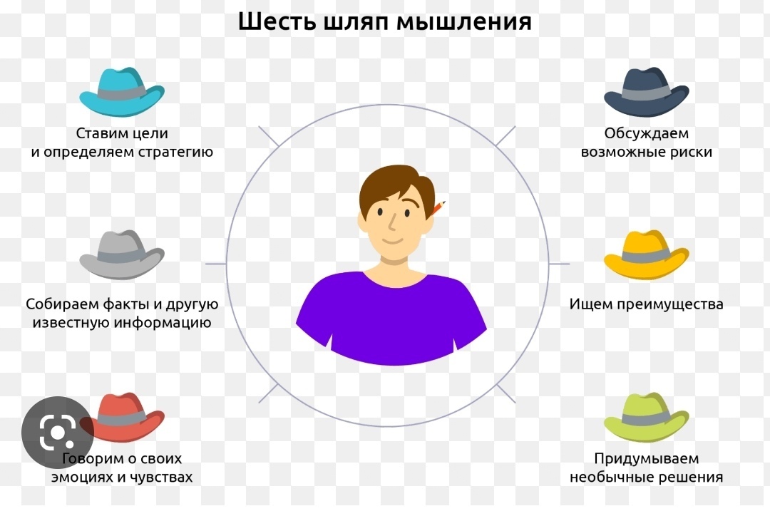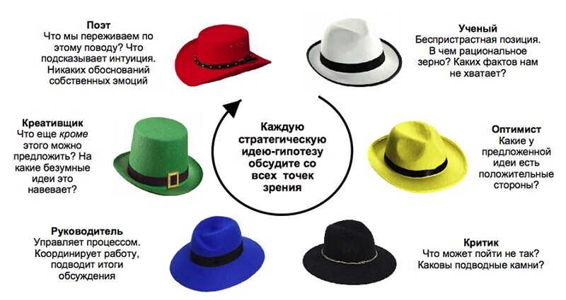 Чтобы решить какую-то задачу, нужно «примерить» разноцветные шляпы. Это можно делать в команде, где вы по очереди «надеваете» воображаемые уборы, или самому.