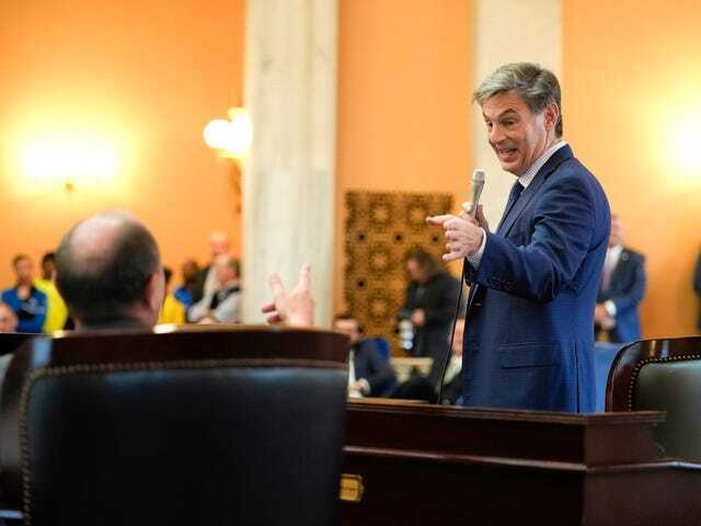 14 декабря 2022 года; Колумбус, Огайо, США; Сенатор от штата Огайо Джей Хоттинджер из Ньюарка указывает пальцем на сенатора Мэтта Долана во время чествования его десятилетий государственной службы в США.