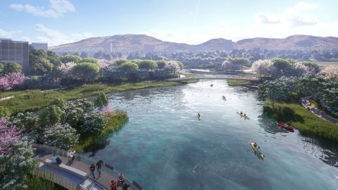 Для борьбы с нехваткой воды парк будет орошаться очищенными сточными водами, поставляемыми близлежащим заводом, а озеро площадью 3,7 акра, перепрофилированное из бывшей олимпийской зоны каноэ и каяков, будет собирать и хранить ливневую воду.