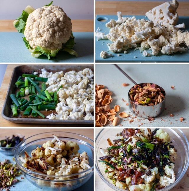 Итак, вот салат, которого я жаждал на прошлой неделе, прежде чем прыгнуть на самолет в Миннеаполис. После того, как салат стал таким дорогим, мне показалось своевременным сосредоточиться на салате без листьев… пока я не увидел цену на цветную капусту. Но прелесть такого салата в том, что вам не нужно слишком привязываться к этим конкретным ингредиентам. Это всего лишь шаблон для того, что я считаю превосходным теплым овощным салатом: крепкий овощ, обжаренный почти до тех пор, пока края не подгорят, но все еще немного кусаются внутри, поэтому он не превращается в кашу. что-то соленое и хрустящее; здесь я использую нарезанные соленые фисташки, но вы можете использовать другой орех или семена подсолнечника. Затем нужно что-то сложное, например, маринованный или жареный лук; здесь я использую дольки зеленого лука, потому что зеленый лук в моем холодильнике чаще, чем что-либо еще. Теплый салат может выдержать очень яркую заправку, так как жара приглушает его, поэтому я использую целый лимон в своем, но для гармонии я также добавил кусочки нарезанных сушеных фиников (но другие сухофрукты тоже подойдут). ). Вместе это идеально подходит для меня, и я надеюсь, что потребуется совсем немного настроек, чтобы быть идеальным для вас.